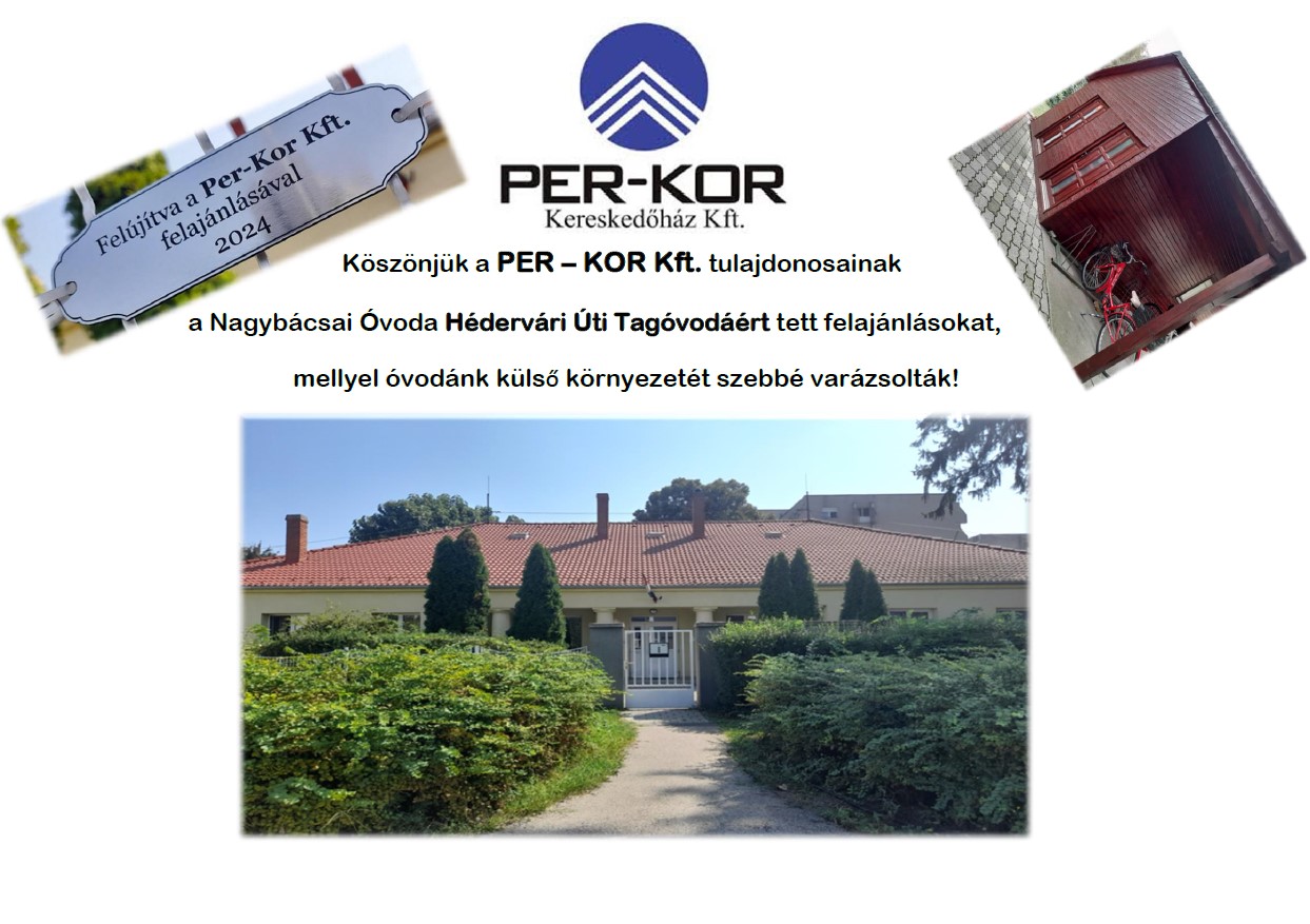 2024-ben a PER-KOR KFT támogatási szerződést írt alá Győrben a Nagybácsai Óvoda Hédervári Úti Tagóvodájával. A felújítás keretében a PER-KOR KFT által megbízott alvállalkozó javította az óvoda nagykapuját, valamint festette le a kapukat, a kb. 60 m hosszúHédervári Úti Tagóvoda kerítést és az óvoda melléképületét. A felújítás valamennyi költségét - mintegy 1 millió Ft + ÁFA összeget - a PER-KOR KFT állta. Bővebben erről ide kattintva olvashat.