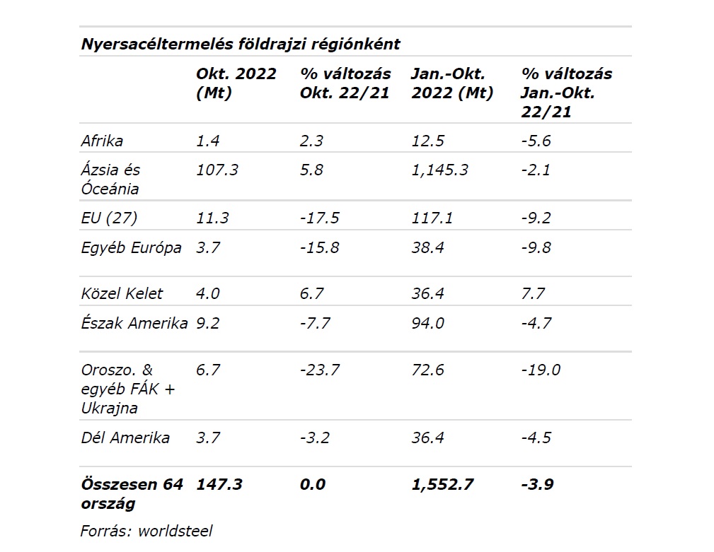 A World Steel Association (worldsteel) számára adatokat szolgáltató 64 ország nyersacéltermelése 2022 októberében 147.3 millió tonna (Mt) volt, azaz 0.0% volt a változás 2021 októberhez képest.