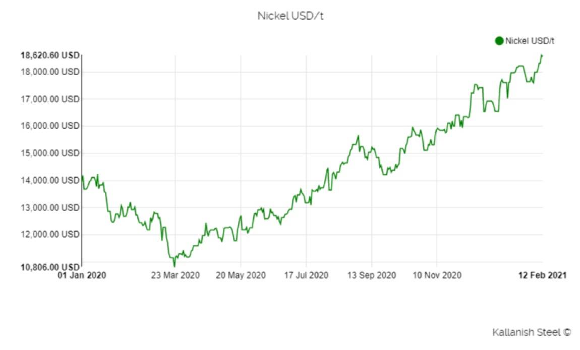 A nikkel ára 2014 óta a legmagasabb a növekvő EG akkumulátor kereslet mellett