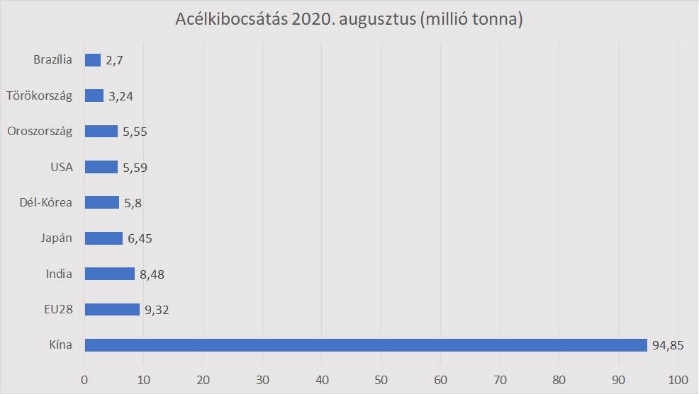 A január-augusztusi globális acélkibocsátás a fentiek ellenére még mindig -4.2%-os év / év csökkenést mutat, 1.19 milliárd tonna acélkibocsátással.